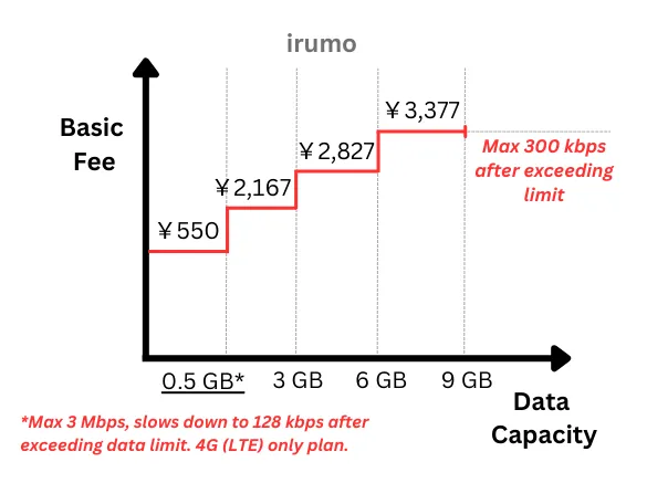 For example, their cheapest plan, irumo, starts at 550 JPY for 0.5 GB of data per month, but if you use more than 3 GB, the fee increases to 2,167 JPY.