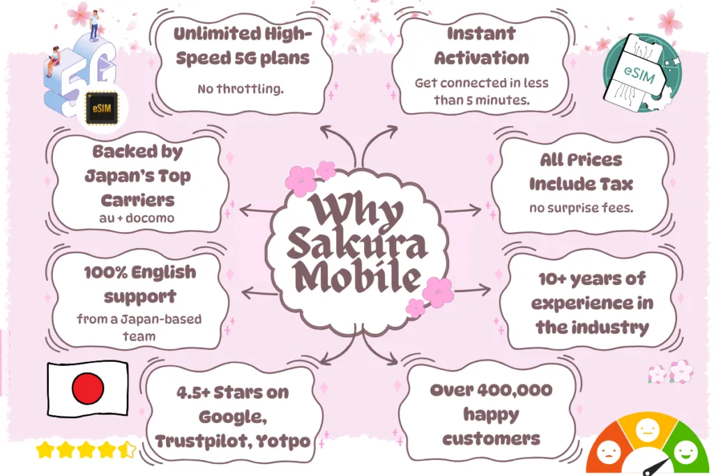 - 4.7★+ on Trustpilot:Real reviews from travelers who love Sakura Mobile's speed, coverage, and support.