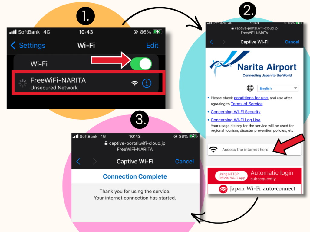 To access Narita Airport’s Free Wi-Fi service, follow the illustration below, with step-by-step text underneath.