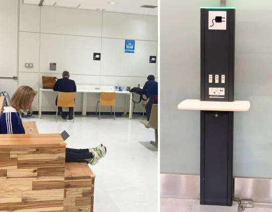 Recharging spots for your devices are available in a number of locations throughout the terminals and are free of charge. They can be found at: