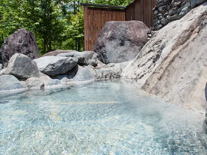 Choose between a Japanese-style room and Western-style room with excellent views of the Northern Alps or the forest. There are no rooms with private onsen attached, but there is a private onsen available for rent for 50 minutes at 3,000 JPY. Be sure to reserve a time slot when you check in. The large public onsen sport great views of the snowy mountain landscape in winter, and bright green mountain landscape in the summer.
