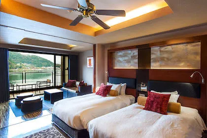 Suiran Hotel Kyoto is a luxury western-style hotel with various Japanese elements. Located on the west side of Kyoto, on the Katsura River, enjoy a relaxing and luxurious stay here. There are no large public baths or rental private baths, but some of the rooms have a private onsen attached if you want to soak in an outdoor onsen while taking in the view of the Arashiyama Mountains.