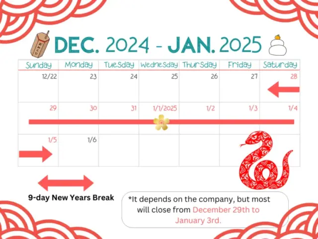 Most companies will close from December 28th or 29th to January 3rd, though some businesses may close earlier or reopen later. Taking advantage of this break, many people in Japan go back to their hometowns or travel during the end of the year, which leads to crowded airports, trains, and expressways. Make sure to plan accordingly!