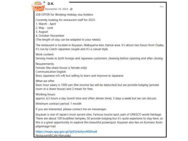 For example, here are some job listings targeting working holiday visa holders in Okinawa (from Jobs on Okinawa and Working Holidays in Okinawa Facebook groups).
