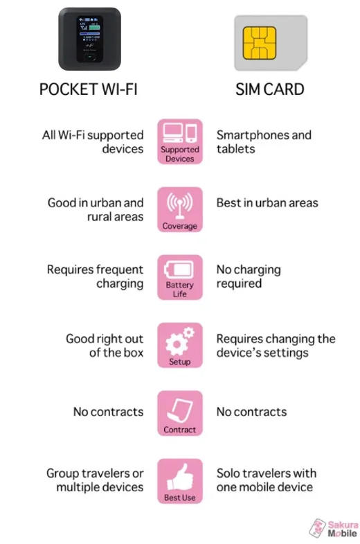 When it comes to Haneda Airport WiFi rental, you have two options: Pocket WiFi and Data SIM Cards. Each has their pros and cons, which you can read more about here. If you already know what kind of device you want when you're in Japan, then skip to the relevant Haneda Airport comparison below.
