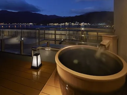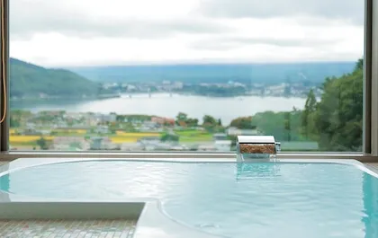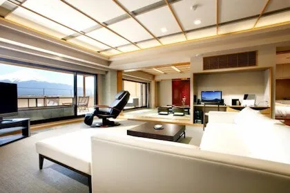Fuji Lake Hotel has many different western-style rooms with outdoor private onsen attached. Some of the rooms even have Japanese elements like raised tatami seating, and beautiful views of Lake Kawaguchi and Mount Fuji depending on your room.